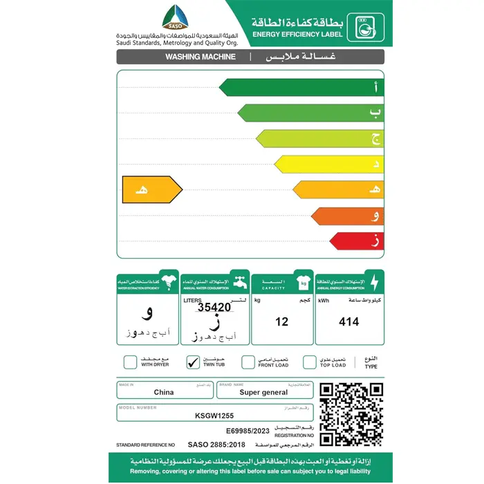 غسالة ملابس حوضين 12 كيلو سوبر جنرال – أبيض KSGW1255
