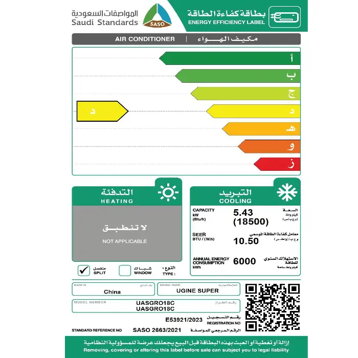 يتميز المكيف بقدرة تبريد فائقة مع استهلاك موفر للطاقه الكهربائيه حيث ان فئة كفاءة الطاقة له هي الفئة (D) مما يوفر لك توفيرا كبيرا في التكاليف