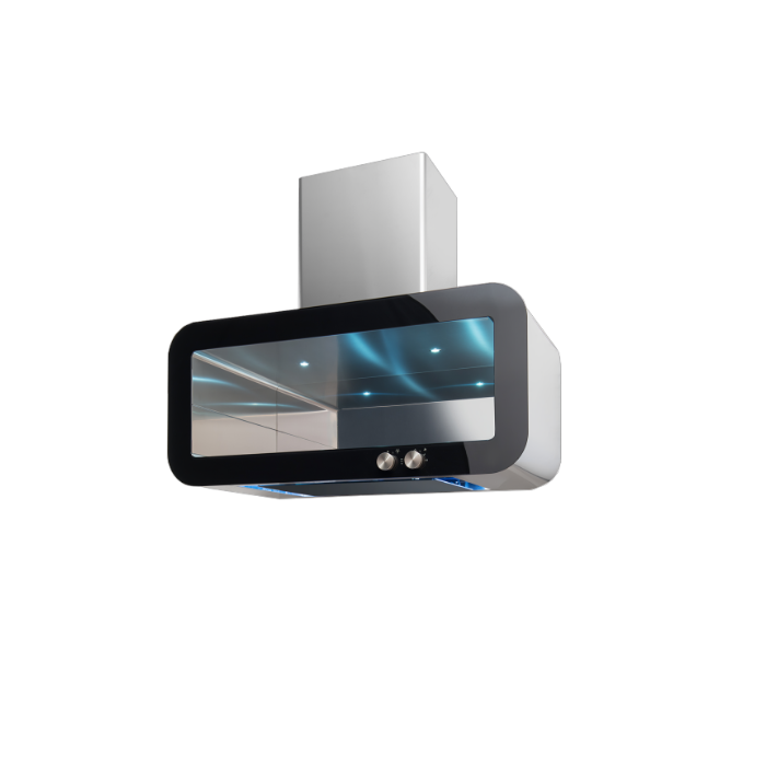 يتميز تصميم الشفاط بطابع عصري وأنيق يجمع بين الزجاج الشفاف والإطار الأسود اللامع مع لمسة من الستانلس ستيل الرفيع يمنح الشفاط شكلاً انسيابيًا وجذابًا يندمج بسلاسة مع ديكورات المطابخ الحديثة تعكس واجهته الزجاجية الإضاءة الداخلية بشكل جميل ما يضفي لمسة فاخرة على المكان ويُظهر الاهتمام بأدق تفاصيل التصميم