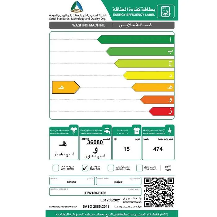 غسالة حوضين هاير 15 كيلو – أبيض HTW150-S186
