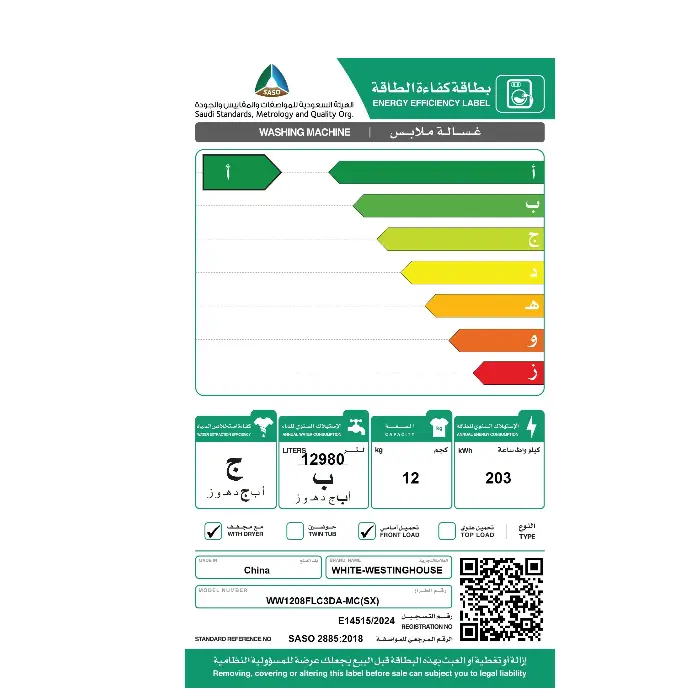 تتميز غسالة وايت وستنجهاوس  بأنها موفرة للطاقة بشكل كبير مما يوفر عليك المال ويمنحك شعور بالراحة وعدك القلق تجاه فواتير الكهرباء الخاصة بكم