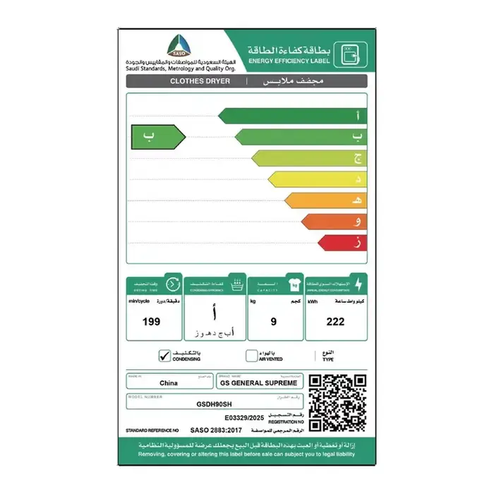 مجفف جنرال سوبريم تعبئة أمامية 9 كيلو 15 برنامج انفرتر – فضى GSDH90SH