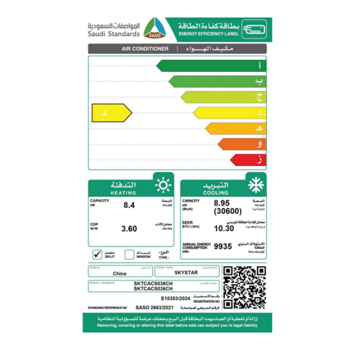 مكيف اسبلت سكاي ستار 30600 وحدة حار / بارد – أبيض SKTCACS036CH