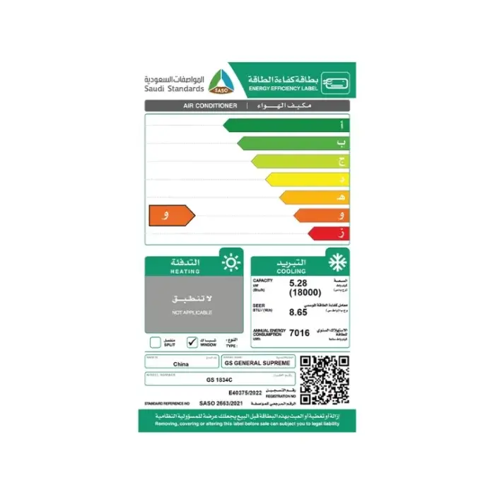 مكيف شباك 17800 وحدة جنرال سوبريم تيربو حار/ بارد - أبيض GS1834H 1,332 ر.س